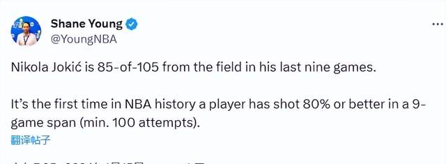 算上这场比赛,约基奇在过去9场比赛中,合计105投85中,命中率来到80.95%。根据记者统计,这是这是 NBA 历史上第一次有球员在连续 9 场比赛(至少 100 次出手)内投篮命中率达到 80% 或更高,约基奇再度创下了一项属于自己的历史纪录。