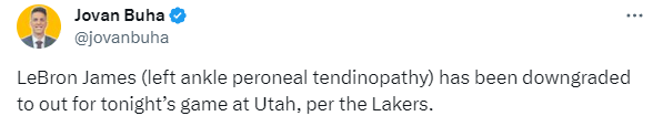 24直播网01月14日讯 ,詹姆斯因伤确定休战,据湖人随队记者Jovan Buha报道,詹姆斯的状态降级为缺战,他因左脚踝肌腱伤势将不会出战与爵士的比赛。