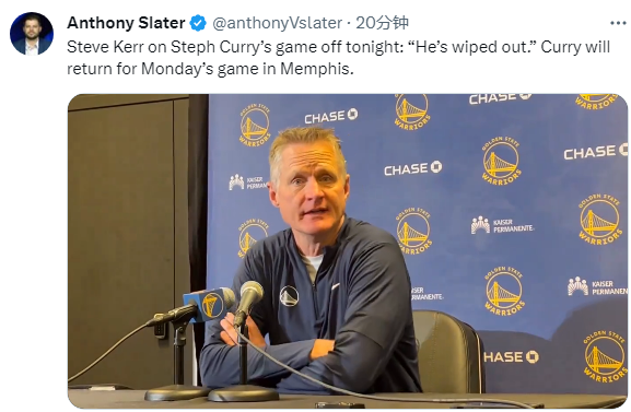 库里轮休从而无缘大战雄鹿,这是库里本赛季第3次休战,赛季首次轮休;对于库里轮休,勇士主帅科尔表示:他就是太累了,他整年都保持了健康,我们非常非常地依赖他,他太累了,需要休息一晚。