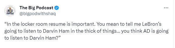 湖人名宿奥尼尔在节目中表示:“我知道的是,在更衣室里,履历是非常重要的。你(主持人)的意思是詹姆斯会在那些最重要的事需要决断时听哈姆的话?我知道答案,你自己琢磨琢磨吧。你认为浓眉会听哈姆的话吗?”