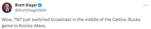 三节打完雄鹿111-70已经领先41分,据NBA记者Brett Siegel报道,TNT临时换台,把雄鹿和绿军的全美直播换成了独行侠尼克斯的比赛。之后雄鹿官方发推质问TNT为什么把全美直播撤销了。