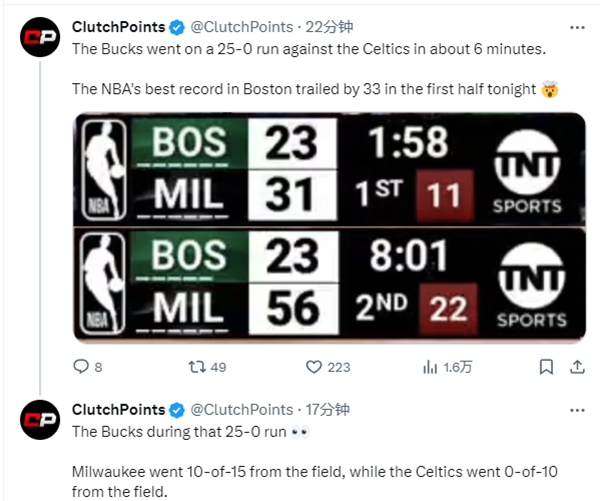 雄鹿33分狂赢联盟第一:25-0打得绿军提前半场投降 全美直播被突然取消