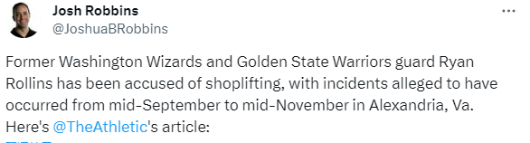 24直播网01月12日讯 ,据美媒The Athletic记者Josh Robbins报道,前勇士奇才球员罗林斯摊上事了,因多次偷东西被指控偷窃罪;据悉,21岁的罗林斯7次偷窃蜡烛、沐浴露等物品,每次金额都不超过1000美元。
