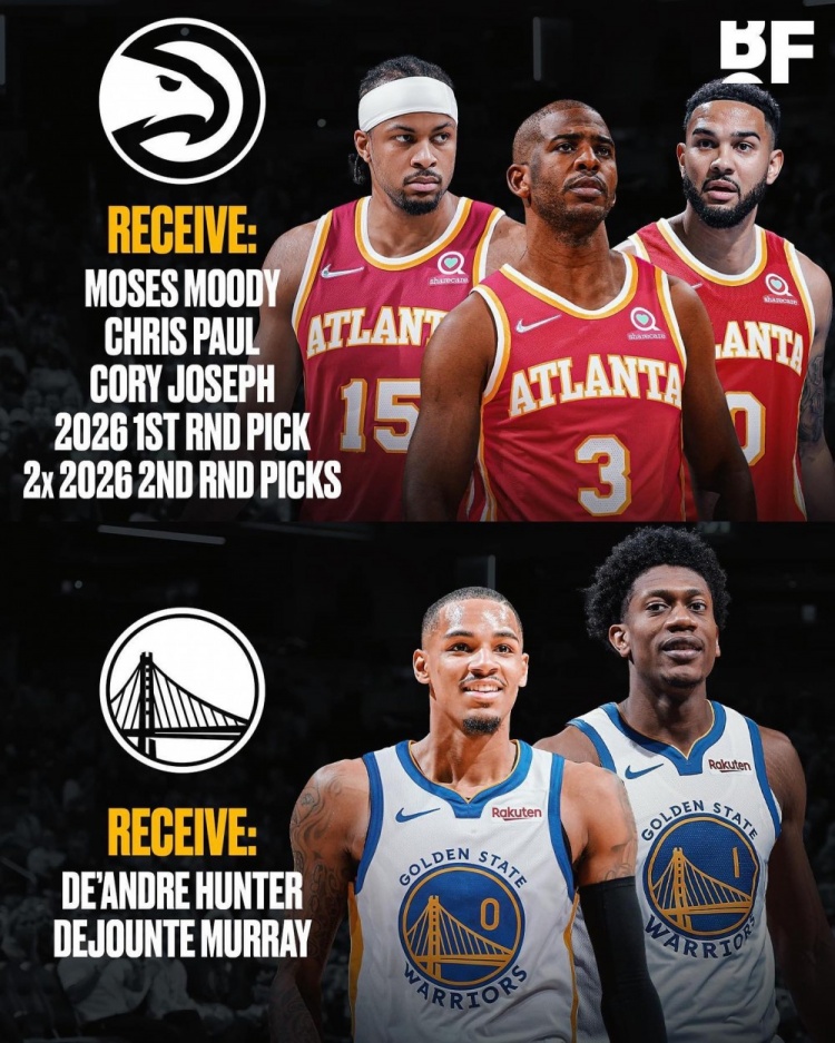 据此前报道,勇士有意德章泰-穆雷和西亚卡姆,维金斯、保罗等人都可能是勇士的交易筹码,美媒《露天看台》记者Dan Favale列出勇士和老鹰6换2交易方案,具体情况——勇士送出穆迪+保罗+约瑟夫+1个2026首轮签+2个2026次轮签,从老鹰得到德章泰-穆雷+亨特。
