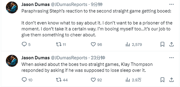 对于被主场球迷狂嘘,库里表示:“很明显我们表现得很挣扎,所以没有什么值得欢呼的,我们的工作是给他们一些值得欢呼的东西,但我们还没有做到这一点;老实说,凭我们这种表现,我在脑海里也在嘘自己和球队。