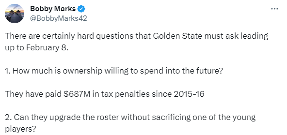 勇士连续7个主场的战绩为2胜5负,目前17胜20负排在西部第12位,距离西部第6相差5个胜场;勇士陷入困境,NBA薪资专家BobbyMarks发推总结勇士现状,写道:在2月9日(交易截止日)之前,金州勇士队肯定必须去问一些棘手的问题。