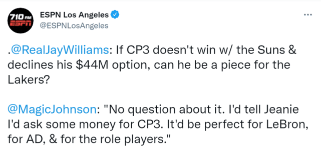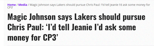 节目上,主持人杰-威廉姆斯询问道:“如果保罗今年没有夺冠,拒绝执行4400万的球员选项,他能成为湖人的一块拼图吗?”约翰逊的回应是:“毫无疑问。我会告诉珍妮(湖人老板),给CP3一些钱吧。对于勒布朗和AD来说,他是完美的搭档,对于湖人的角色球员来说,也是如此。”