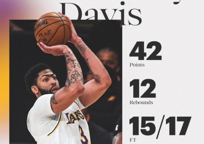 24直播网讯 北京时间5月10日,面对战绩排在全联盟第2的太阳,湖人在残阵情况下凭借浓眉哥打出赛季最佳表现最终获得胜利。这场比赛,浓眉哥足足拼了41分钟,攻防两端不留余力狂砍42分12板5助攻3抢断3盖帽的全面数据!是湖人队史近20年第一位打出这串数据的球员!戴维斯的疯狂表现引来众美媒热议!