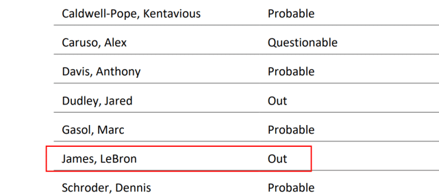 24直播网讯 北京时间4月28日,NBA官网公布了明天湖人vs奇才的最新伤病名单。湖人队一方,詹姆斯和杜德利同为Out,两人继续缺阵;浓眉、波普、小加索尔、施罗德同为Probable(75%可能出战),大概率能打;上一场出现背部痉挛的卡鲁索状态为Questionable(50%可能出战)。