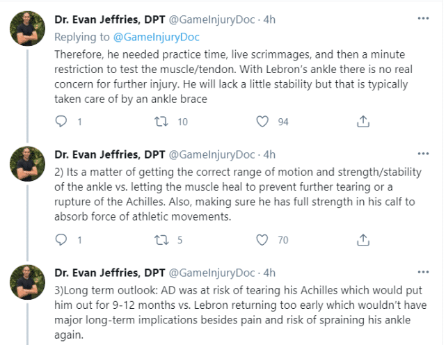 “其二,詹姆斯的脚踝(保护)关键在于保持正常范围内的运动强度、稳定性。戴维斯的问题是让肌肉恢复,以防止出现跟腱撕裂或者断裂。与此同时,还要确保戴维斯的小腿有足够的能力去吸收运动带来的力量。”