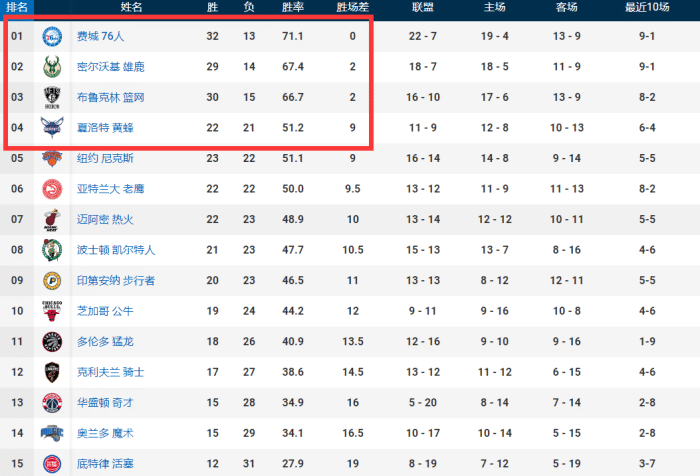 可以看到,现排在第4的黄蜂已经落后第3的篮网足足7个胜场,在常规赛只剩下不到30场比赛(本赛季常规赛只有72场)的情况下,排在篮网后面的球队要想抹平至少7个胜场的差距,显然是很难发生的。毕竟篮网、雄鹿、76人这三支球队最近这段时间的状态都很出色,费城没有恩比德依然在近10场比赛中拿下了9胜1负的顶级战绩,雄鹿近十场也只输了1场,篮网则输了2场!
