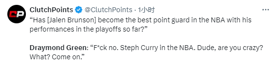 24直播网讯 北京时间5月10日,布伦森已经是联盟最好控卫吗?勇士球星追梦格林在节目中爆粗回应此事,追梦激烈表示:TMD,不是!斯蒂芬-库里还在NBA呢兄弟!你疯了吗?啥玩意?别了吧,这太离谱了,库里还在NBA呢,他仍然出色,停止这个说法吧,啥啊这是?卢卡-东契奇也是一个控卫呢。