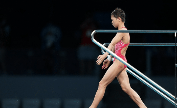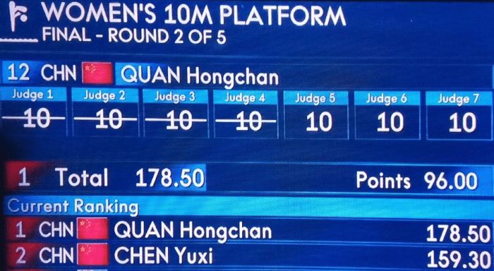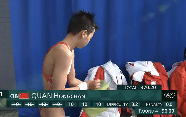 第四轮的全红婵再度拿下了满分之跳,难度3.2的倒立动作几乎没有水花,领先的优势进一步扩大。