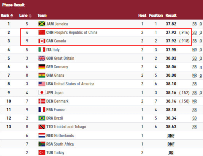 值得一提的是中国队和加拿大队都是37秒92的成绩,但是对比千分秒,中国队是37秒92(916),加拿大队是37秒92(918)依靠着这样极其小的优势,中国队拿下了小组赛第一名,确实太燃了。