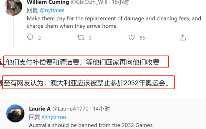很多外国网友对澳大利亚运动员的恶劣行为,进行了批评和指责,甚至有澳大利亚网友公开道歉。而一些网友认为,“澳大利亚应该被禁止参加2032年奥运会”。