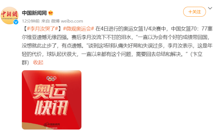 24直播网讯 北京时间8月4日,中国女篮70-77不敌塞尔维亚,奥运会遗憾止步8强。这个成绩虽然国人可以接受,但对于中国女篮姑娘们自己来说,这个成绩还是很难令她们满意。赛后,中国女篮内线李月汝痛哭落泪,直言很遗憾。