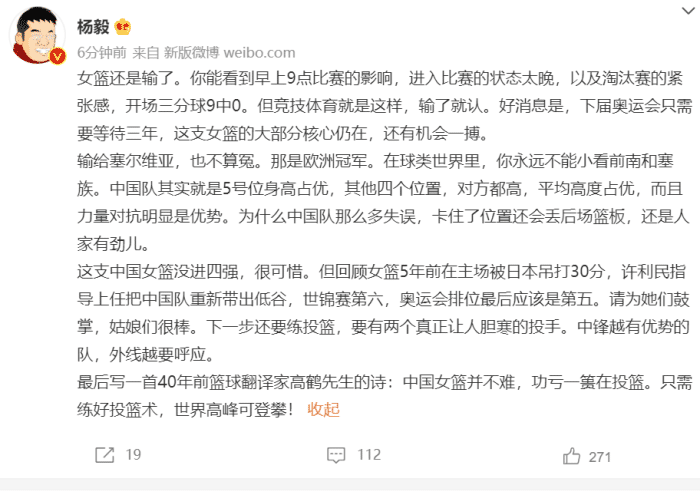 值得一提的是赛后国内几大篮球名嘴也给了女篮很高的评价!王猛表示看到了女篮的进步和努力,对她们的表现非常满意!杨毅则分析了塞尔维亚的身高优势,称赞许利民指导把女篮带出了低谷,强调女篮要加练投篮,未来可期。