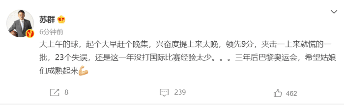 苏群则认为这一年打国际大赛太少了,我们需要多打比赛增加经验,成熟起来就能更进一步!宝岛名嘴朱彦硕更是表示输球不该责怪任何人,看到了女篮未来夺牌的希望,称赞锋线的实力已经达到了国际一流的水平。不得不说看到这些很感动,我们不该“唯奖牌论”“唯赢球论”现在的女篮真的给了我们很大的希望,继续为她们加油,勇攀高峰!