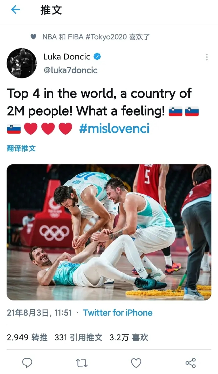这么强的球队为何第一次打奥运会呢?一是因为名额有限,二是因为欧洲的竞争本就激烈,此前没有东契奇的情况下,也只能算中等偏上球队不算豪强!有趣的是今日击败德国后,东契奇发推“世界前4!一个只有200多万人的国家!这是何等的心情!”