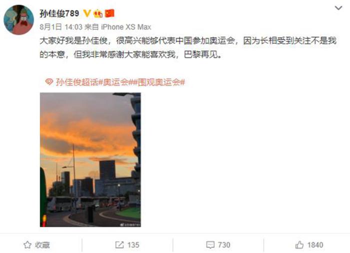 孙佳俊并没有提到自己在比赛的过程当中被裁判吹罚犯规的事情,他只是向喜欢他的朋友们表示:“大家好,我是孙佳俊。很高兴能够代表中国参加奥运会。因为长相受到关注不是我的本意,但我非常感谢大家能喜欢我,巴黎再见。”也许对于孙佳俊和他的队友们来说,这届奥运会并不是十分地完美,但是孙佳俊并没有过于纠结裁判的问题,而是将眼光放到了未来的巴黎奥运会当中。