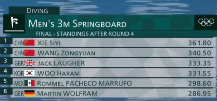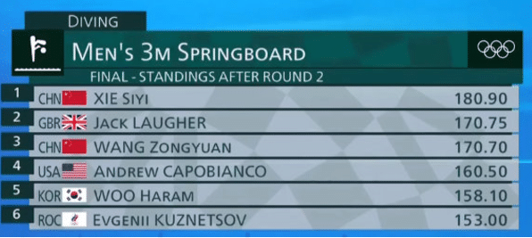 王宗源207C,背身翻腾三周半,难度系数3.6,拿到了91.8的高分,王宗源的总分是432.30分,领先第三名英国选手2.05分。