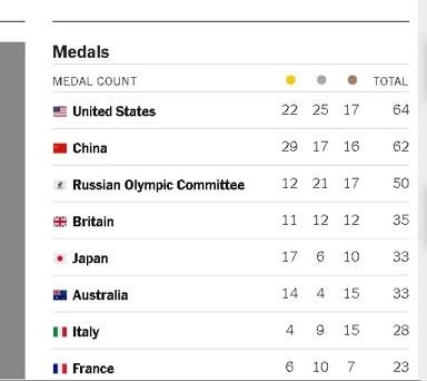 24直播网讯 本届奥运会赛程已经过半,中国健儿表现神勇。截止到北京时间8月3日13点,中国代表团已经获得了29金18银16铜,比暂列第二名的美国多出了7枚金牌。尽管中国暂时领跑,然而令不少中国网友感到哭笑不得的是,在美国媒体看来,他们才是奖牌榜第一位。