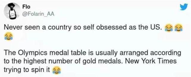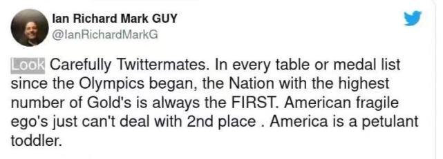 而不少外国网友也纷纷发文吐槽美国媒体的行为:“从来没有看过像美国这样自恋(self obsessed)的国家,奥运会金牌榜通常都是根据金牌数来排列。美国媒体这是别出心裁啊。”,还有网友吐槽道:“自从奥运会开始举办以来,所有的奖牌榜都先计算金牌。美国人脆弱的自尊心无法接受第二名,美国就是个妄自尊大(petulant)的小屁孩。”