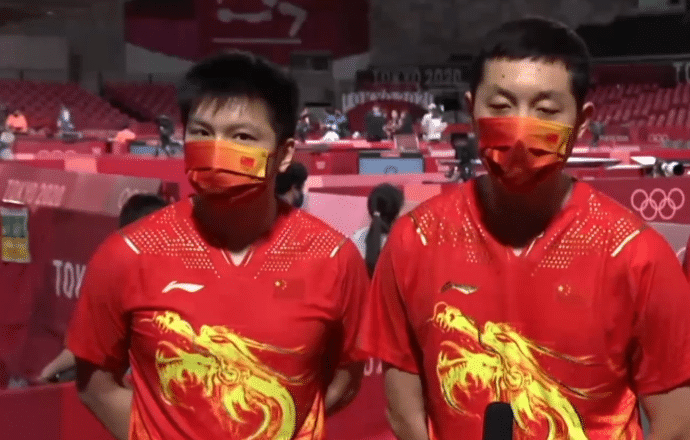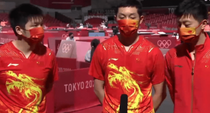 中国乒乓球男团以3-0晋级到八强,比赛结束之后的场边采访,马龙、樊振东和许昕接受提问,第一个问题是首场团体赛的感受,问题出来的时候许昕低头,樊振东一个眼神示意,马龙向前一步走,说出了自己的感受。