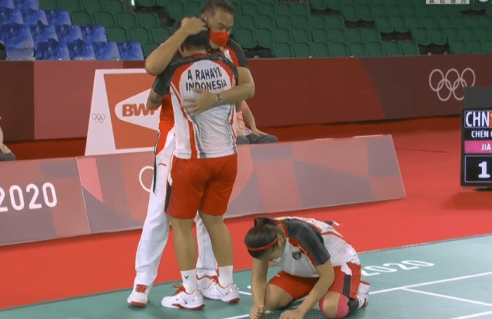 第二节比赛后段,中国组合连续追分,但是无奈的是前面分差太大,最终印尼组合21:15赢下第2局,陈清晨和贾一凡0-2不敌印尼组合拿到银牌,印尼组合夺得金牌,印尼的两名选手失声哭泣,这块金牌对于她们来说太不容易了,中国队的陈清晨和贾一凡也是暖心安稳并且送上祝福。