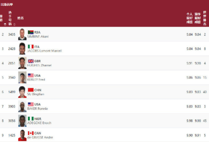 决赛的舞台苏炳添是8名运动员中唯一的黄种人,也是世界排名倒数第二低的运动员,第40名的世界排名仅仅比尼日利亚的选手第45名高一些。进入到百米决战的运动员包括了世界排名第2、3、4、5、8的顶级短跑战将。从这点就可以看出苏炳添能够晋级到奥运会的百米决战,有多么不容易。