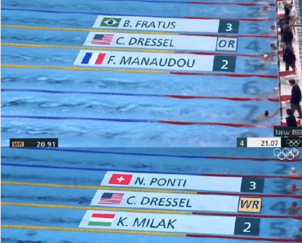 男子50米自由泳,21秒07打破奥运会纪录,金牌;