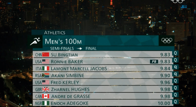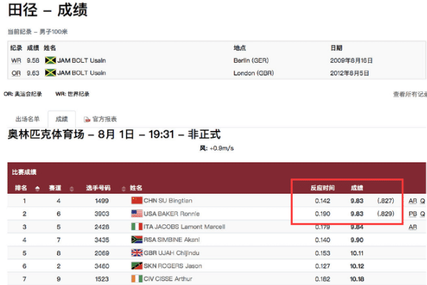再看下半决赛的成绩,苏炳添排名第一,他以千分秒的成绩击败了第二名,美国选手贝克的成绩也是9秒83,但是在比较千分秒的时候,苏炳添比对手更快,这样苏炳添成为历史上第一个在百米飞人大战中取得第一名的亚洲人。