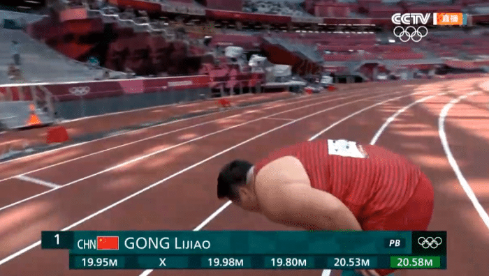 32岁巩立姣全场领先,两次投出20米以上的成绩——第五投20米53和第六投20米58,投出个人最好的成绩,全场压制对手,毫无悬念地夺得女子铅球金牌;第五投之后,巩立姣在比赛现场露出发狠的表情,更是高呼:中国牛!