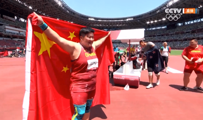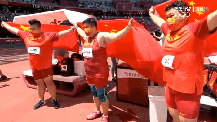 巩立姣身披国旗庆祝夺冠,宋佳媛和高阳也身披中国国旗,中国运动员身披国旗闪耀全场,合影之后,巩立姣冲着镜头用手指着胸前的中国国旗,再次竖起大拇指。