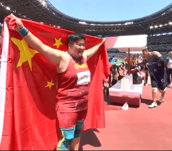 夺冠后,巩立姣身披国旗绕场庆祝,这一刻,她等了太久,4届奥运会的等待,她真的完成了突破,祝贺巩立姣。