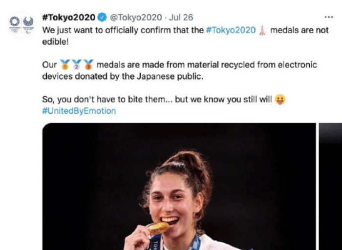 就在近日,东京奥组委针对运动员咬金牌的动作,给出了明确回应,等于是直接官宣,今年的奖牌是不能咬的,因为确实是用回收的电子产品垃圾中制作。