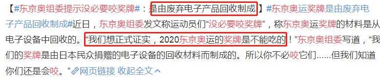 据报道,东京奥组委发文提醒运动员们,没有必要去咬奖牌,因为这些奖牌材料是从电子设备中回收。“我们正式证实,2020年东京奥运会的奖牌是不能吃的,我们的奖牌是由日本民众捐赠的电子设备的回收材料制作而成,所以不要咬他们,虽然我们知道你们还是会咬”。