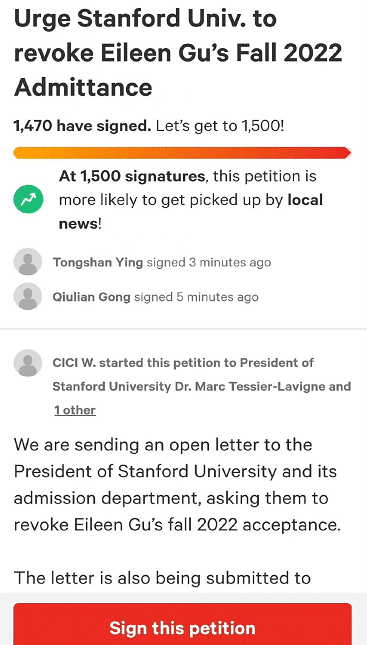 谷爱凌实现了自己的愿望,但却被一些有心之人嫉妒,甚至还有一些人在社交媒体上发起了活动,联署要求斯坦福开除谷爱凌,目前已经有上千人参与,希望可以让斯坦福大学开除谷爱凌。