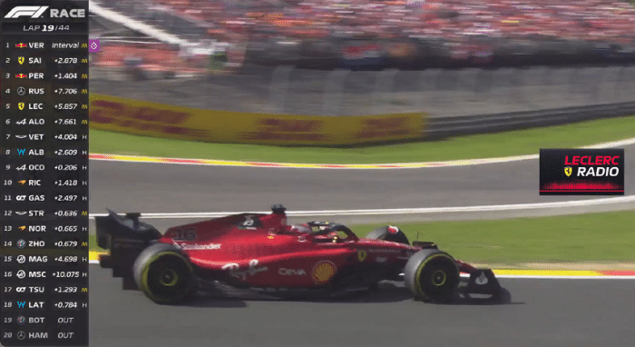 法拉利的目的是为了“搏一把”,希望获得最快圈速的积分,但可惜回到赛道后,软胎的勒克莱尔反而被身后硬胎的阿隆索利用DRS超越,跌至第5。虽然勒克莱尔又超越了阿隆索,但很快宣布勒克莱尔最后一次进站,在维修区超速,罚时5秒。这样因为被加罚了5秒的原因,勒克莱尔的名次滑落到了第6名,确实是偷鸡不成蚀把米。