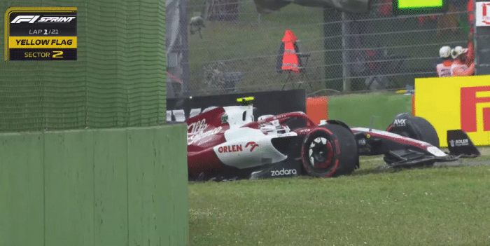 24直播网04月24日讯 ,F1意大利伊莫拉大奖赛冲刺赛,这是周冠宇F1生涯首度参加冲刺赛,前8名获得积分。一个赛季下来也只有3场冲刺赛,可惜的是周冠宇失控撞墙,随后赛车停在了缓冲区,赛会出动安全车,光速结束比赛。这是第一圈,周冠宇被加斯利顶到后赛车失控撞墙,随即结束比赛,加斯利更换前翼后重新加入比赛。
