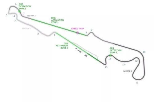 该赛道以其独特的黑蓝相间的缓冲区而闻名,称为“蓝色区域”。缓冲区的表面由沥青和钨的混合物组成,而不是其它赛道中常见的沙砾。第二个更深入的缓冲区被称作“红色区域”,其表面设计更加粗糙,目的是最大限度地提高轮胎的抓地力,从而尽量减少制动距离,尽管这样的代价是轮胎的极度磨损。最后的安全措施是Tecpro护墙,这是轮胎护墙的一种现代化改进。