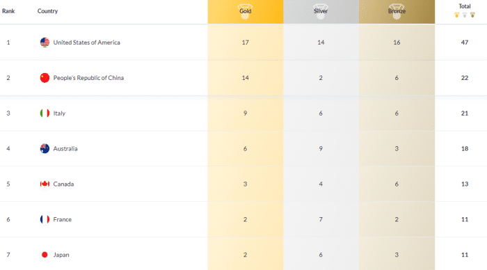 最新金牌榜方面,美国单日收获1枚跳水银牌,17金14银16铜排名第一。中国队单日拿到2金,14金2银6铜排名第二。还有4枚跳水金牌,中国有希望追上美国。意大利再夺公开水域金牌,9金6银6铜排名第三。澳大利亚6金9银3铜第四,加拿大、法国和日本,分列5-7位。